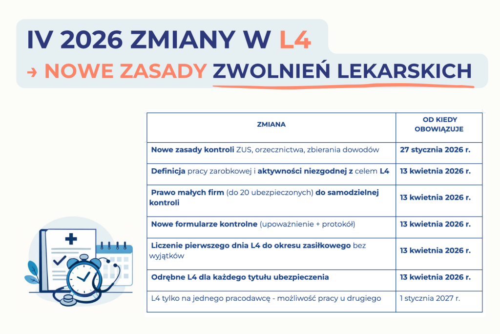 - 13 kwietnia 2026 r. – przepisy dotyczące dopuszczalnych i niedozwolonych czynności na zwolnieniu lekarskim, nowe uprawnienia kontrolne małych pracodawców, zmiana zasad liczenia pierwszego dnia L4